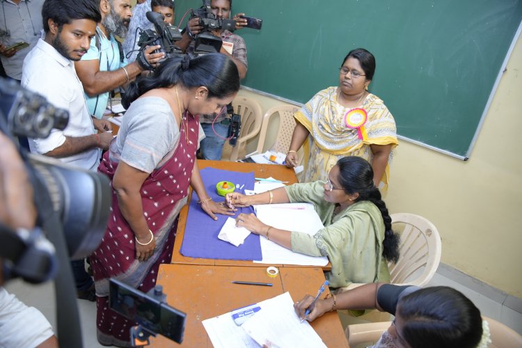 கோவை டாடாபாத் பகுதியில் உள்ள தனியார் பள்ளியில் பா.ஜ.க மகளிரணி தலைவி வானதி சீனிவாசன் எம்.எல்.ஏ வாக்களித்தார்